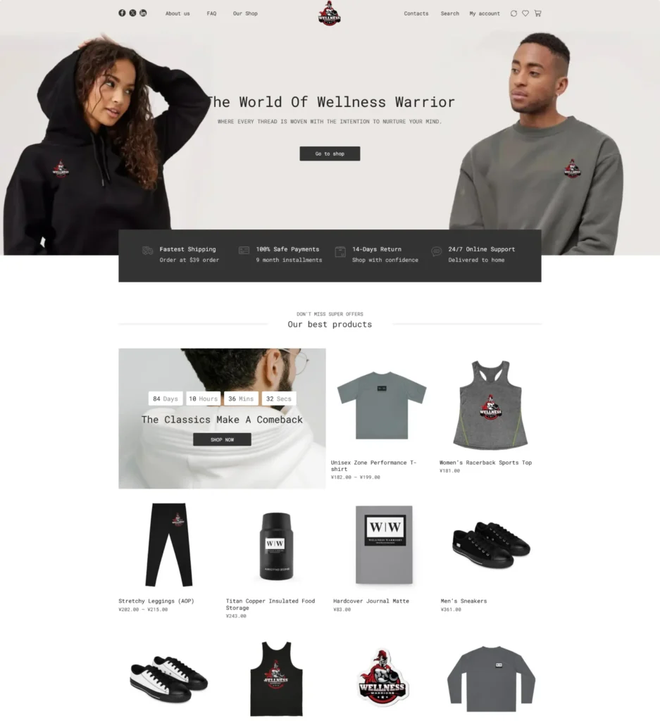I designed and developed a fully customized Shopify dropshipping store for Wellness Warriors Gear, a brand focused on health, fitness, and wellness products.